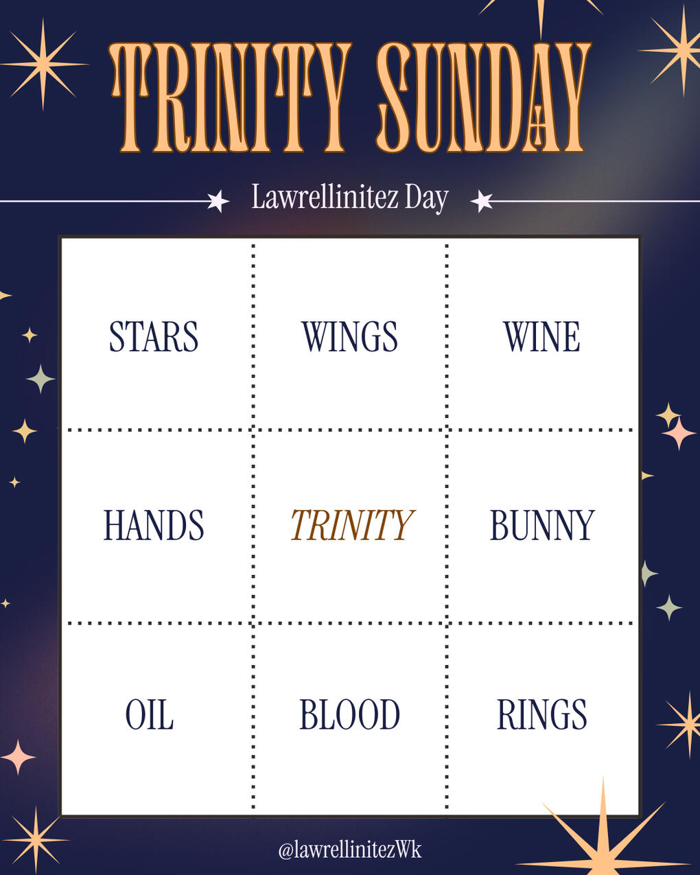 hands + trinity + bunnyYou can meet the prompts by using them as words, themes, images, symbols, colours, motifs, settings, AUs, etc.Some ideas include a fic about stargazing, wings AU, injuries resulting in blood, marriage rings, etc."Trinity" acts as a free space and all lawrellinitez works count as meeting the trinity prompt!